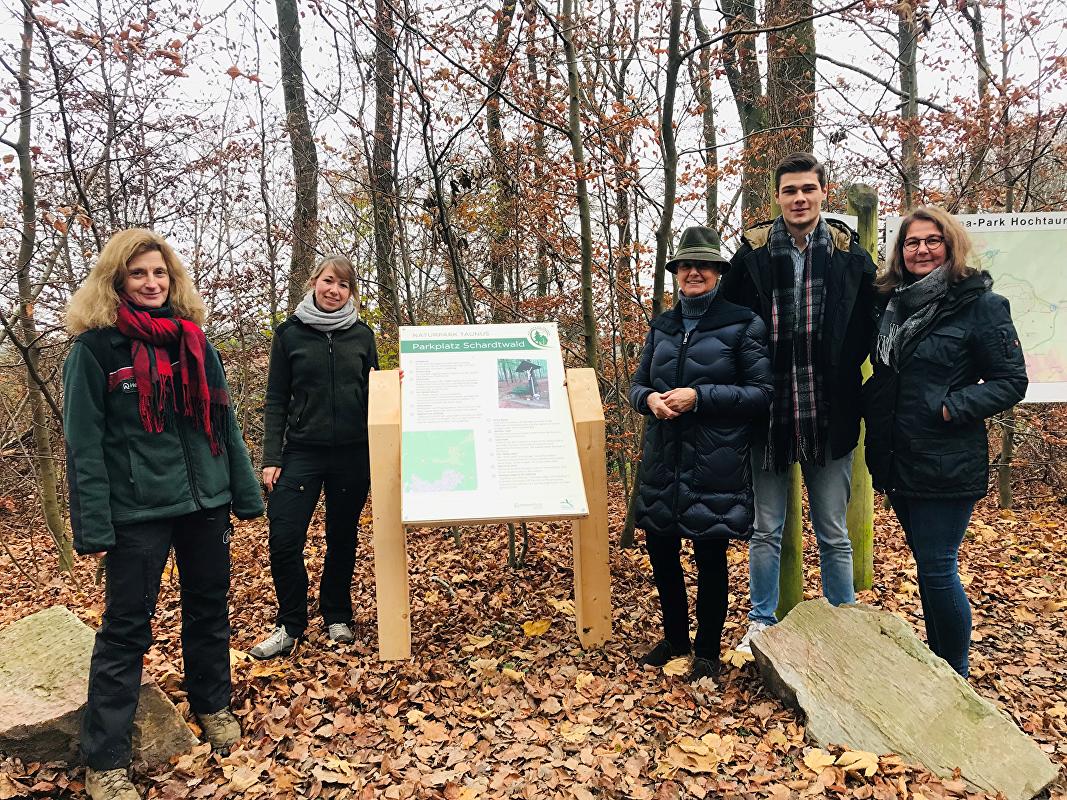 Landrat Ulrich Krebs und Vorsitzender des Naturpark Taunus hatte die Idee der Neugestaltung dieser beiden Tafeln zusammen mit Frau Dorn des Heimatvereins aus Falkenstein. Darauf hin setzten sich der Naturpark Taunus und der Heimatverein an die Inhalte, sowie die Gestaltung. Auch die Stadt Königstein unterstütze dieses Projekt gerne und subventionierte das Projekt mit einer Spende. Bevor Bänke, Hütten oder auch Infotafeln im Wald aufgestellt werden, müssen immer mit dem jeweiligen Flächeneigentümer die Standorte auf verschiedene Kriterien geprüft und anschließend genehmigt werden. Hier kam das Forstamt Königstein mit den Revieren Billtalhöhe und Kronberg ins Spiel. „Das ist auch Naturparkarbeit – die verschiedenen Interessensgruppen in einem Projekt zusammenzuführen und eine lokale Infrastruktur für die Wanderer und Besucher von Nah und Fern zu verbessern“, stellt Carolin Pfaff, stellvertretende Leitung und forstliche Beratung des Naturpark Taunus, fest. Auch Frau Dorn ist begeistert: „Dass der Schardtwald beispielsweise ein Schießplatz früher war, kann jetzt jeder lesen. Das ist historisch wichtig. Besonders gut gefällt uns auch, dass die Tafeln sowohl in Englisch als auch in Deutsch sind – eine tolle Idee vom Naturpark.“